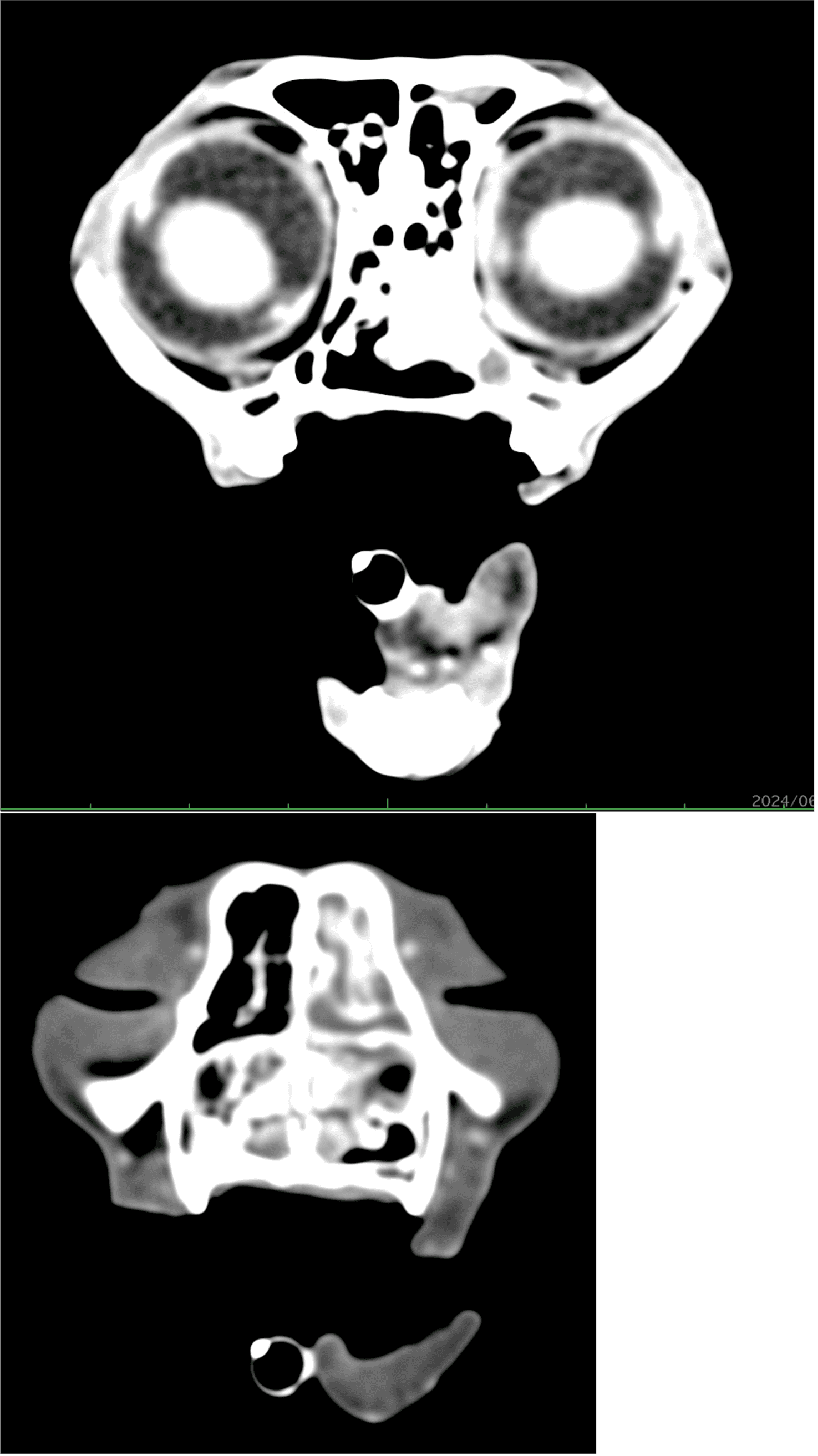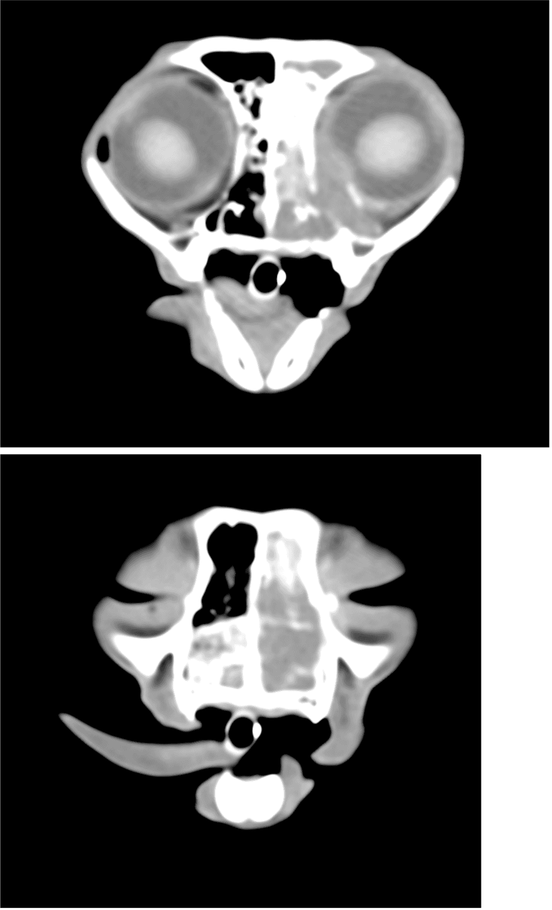体重3.28kg(BCS3/5) 体温38.7℃ 心拍数160回/分 呼吸数28回/分 一般状態 :活動性100% 食欲100% 意識レベル 正常 一般身体検査 :左鼻より黄色鼻汁あり 左目の流涙あり 血液化学検査:特筆すべき異常所見なし 頭部CT(図1参照) 腹部超音波検査:左右腎臓の腎結石あり、その他諸臓器に特筆すべき異常所見なし