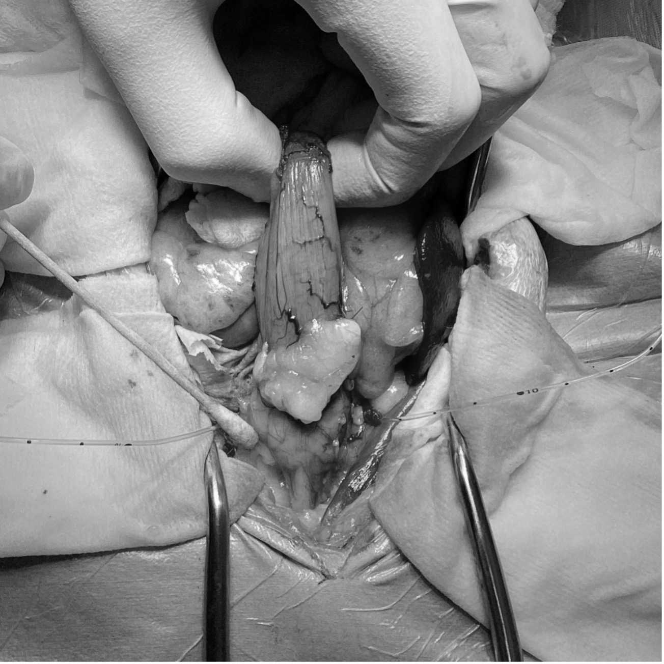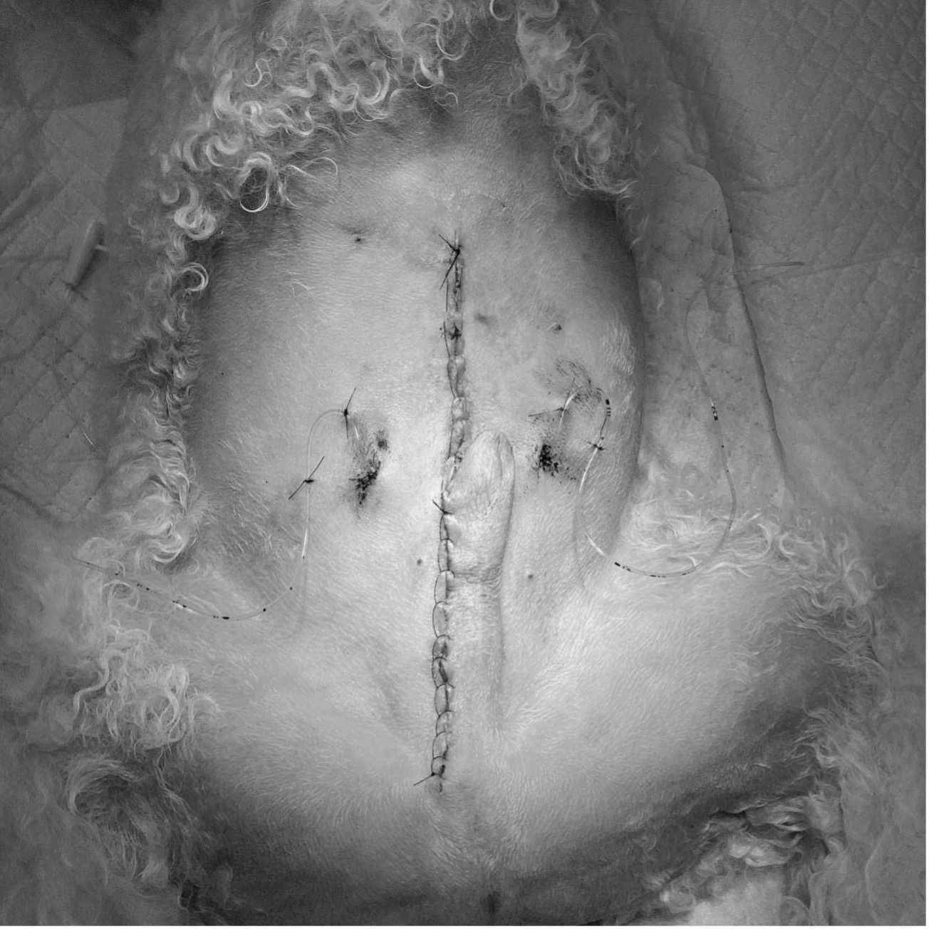 第24病日手術を実施した。胸骨剣状突起から恥骨前縁までの腹部正中切開を行い膀胱、前立腺へアプローチした。左右の尿管を確保し、膀胱移行部を露出後膀胱の近位で左右尿管を離断した。その後尿管にカテーテルを挿入し保持した。膀胱と前立腺、近位尿道を周囲脂肪組織から剥離し、前後膀胱動脈、前立腺動脈を処理し、最後に前立腺から十分距離を確保して尿道を骨盤腔内で結紮離断した。その後、左右尿管を腹壁に造瘻した孔を貫通させ、包皮外側の皮膚に縫合した。(図3,4)術後は左右尿管移設部位にカテーテルを留置し、入院管理を行った。入院5日目にカテーテルを抜去し、尿管移設部位からの尿排出を確認した後に退院となった。病理検査結果は、尿路上皮癌(移行上皮癌)完全切除であった。術後14日目に抜糸を行い、同日ラパチニブを開始した。またNSAIDsとしてフィロコキシブを併用した。 経過は良好であり、ラパチニブ開始から6ヵ月後に再発や転移が認められなかったことから、ラパチニブとフィロコキシブを中止し、現在術後約1年が経過するが再発や転移は認められていない。