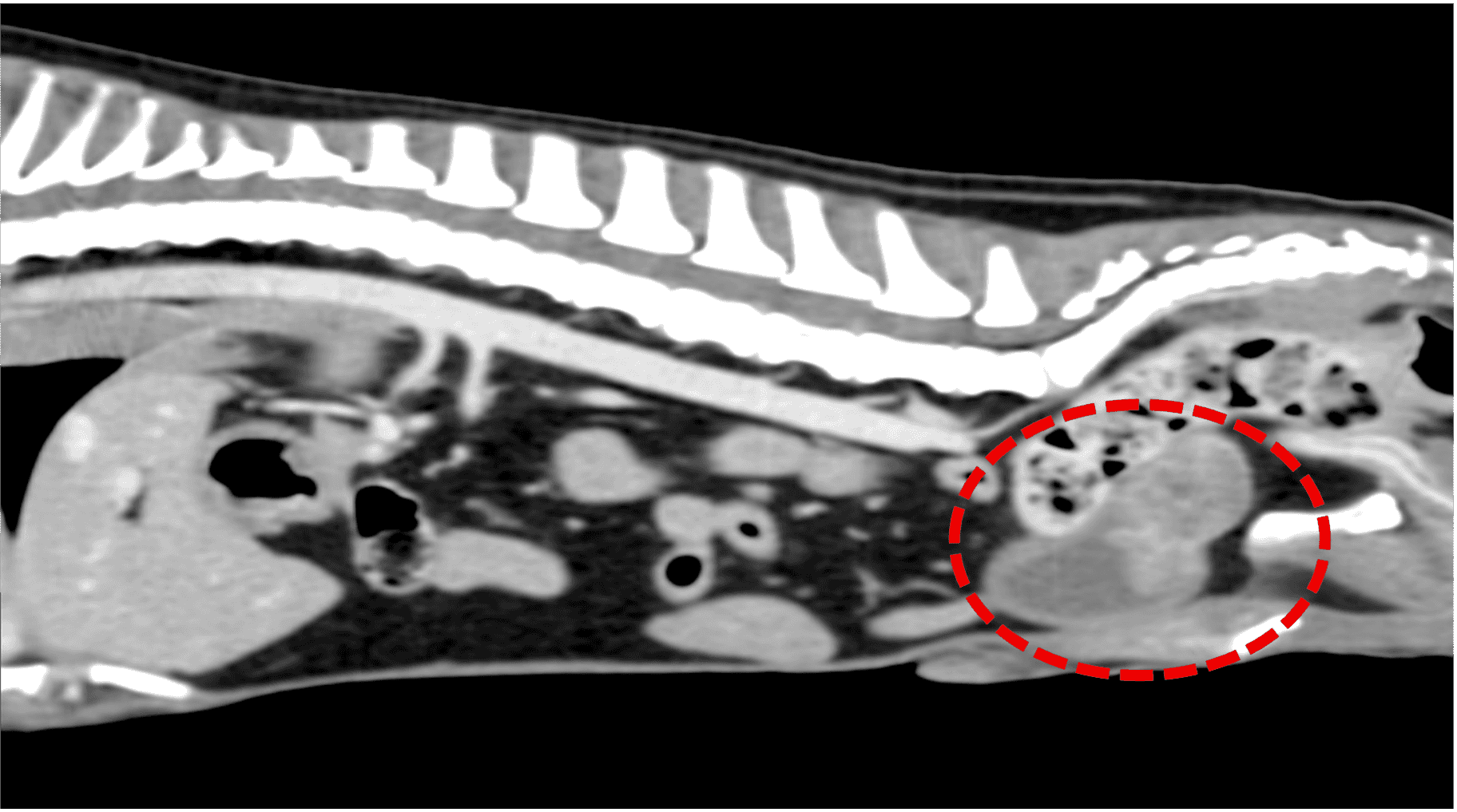 トイプードル 9歳 オス去勢済み 主訴:1カ月前から頻尿、残尿感がありかかりつけ医院で超音波検査を行ったところ、膀胱‐前立腺に腫瘤を認めた