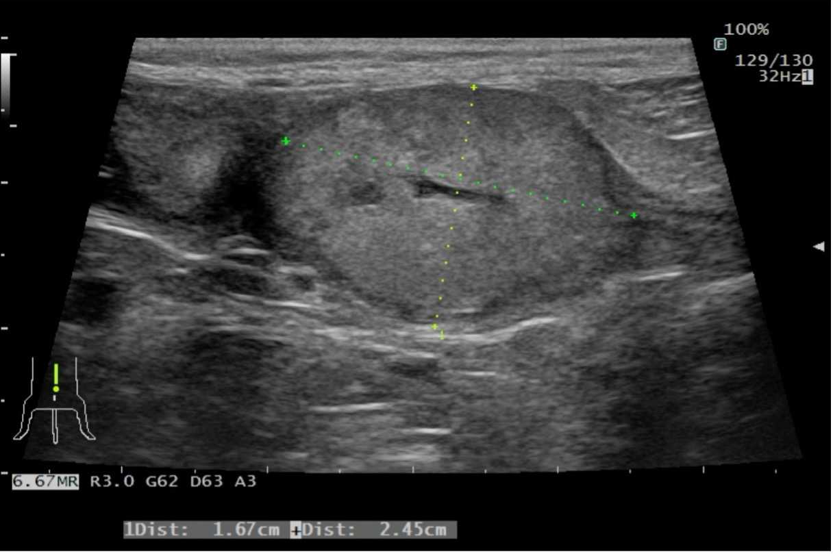 体重5.0kg(BCS3/5) 体温38.9℃ 心拍数114回/分 呼吸数30回/分 一般状態 :活動性100% 食欲100% 意識レベル 正常 一般身体検査 :特筆すべき異常所見なし 血液化学検査:異常所見なし 血液凝固系検査:TAT含め正常値 胸部X線検査:特記すべき異常所見なし 超音波検査:膀胱では膀胱頸部全周において腫瘤病変を認め、前立腺に連続する。この腫瘤は前立腺に主座し膀胱内へ伸展している形態である。(図1)前立腺の被膜構造は正常であり、腫瘤の膀胱外への浸潤は認められない。また周囲リンパ節は正常構造である。 尿道カテーテル採尿:尿沈渣では異型性を強く伴う大型の上皮系細胞が多数集塊を形成して認められる。